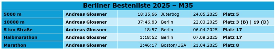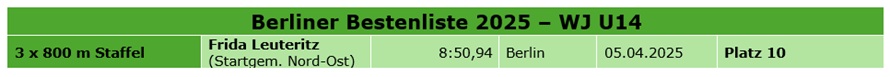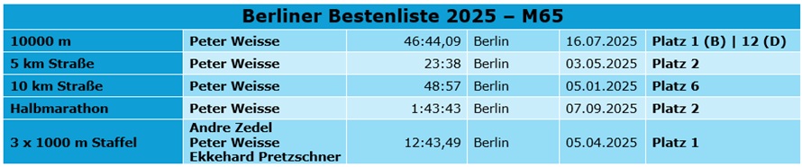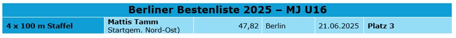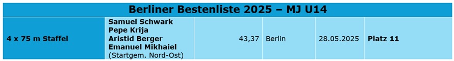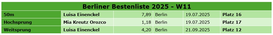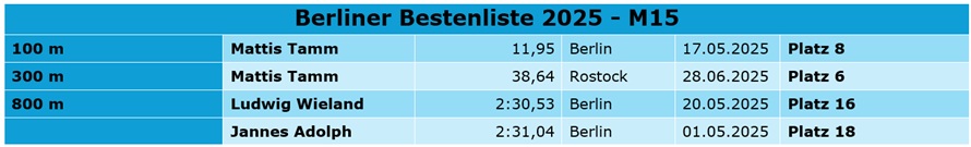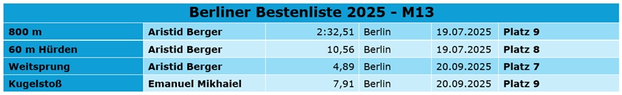 Die hier abgebildete Bestenliste wird aktualisiert, sobald auf der Homepage des Berliner Leichtathletikverbandes eine neue Aktualisierung veröffentlicht wird.