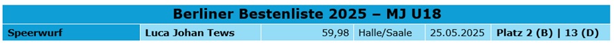 In der Berliner Bestenliste werden die jeweils besten 20 einer Disziplin je Altersklasse gelistet. Wenn hinter der Platzierung noch eine mit (D) erscheint, dann ist es eine Platzierung in der aktuellen Deutschen Bestenliste unter den TOP 30.